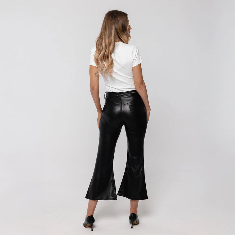 Introducing our first-ever Capri: Meet the Chloe in Onyx—a seamless fusion of bold sophistication and modern edge. Crafted from high-quality black vegan leather, this capri molds to your body, accentuating your figure while ensuring a flexible, comfortable fit. The cropped flare detail, rich black texture, and high-waisted silhouette—borrowed from our best-selling Ali fit—bring together the timeless elements of denim with a luxurious, elevated appeal. Whether styled with a pump, boot, or loafer, the Chloe Capri effortlessly transitions from day to night, offering versatile and refined style at every step. Rüdes Denim "The Chloe Capri".